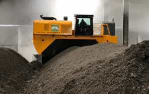 2. Compostaje: durante las siguientes 6 semanas, el compost se somete a una serie de fases de calentamiento para obtener una consistencia perfecta. Se utiliza un volteador autopropulsado Menart SPM-63 para voltear las hileras 12 veces, y el compost pasa tres meses en la instalación.